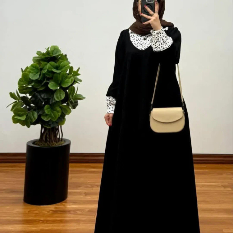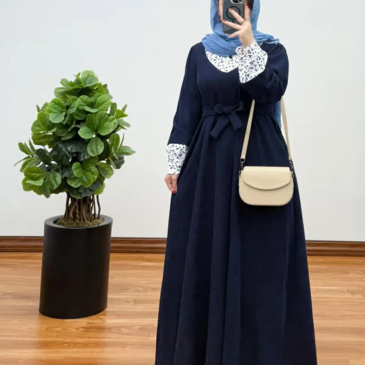 یه پیراهن سوپر کاوش با قد کاملا بلند با کمربند جنسش مخمل کبریتی هستش. سر آستین و یقه مخمل کبریتی طرح اره سر آستین مچی هستش و دکمه خوره کاملا سوپر کلوش. یه کمربند از جنس خودش داره که میتونین ببندین و سایزتوند رو کنید.