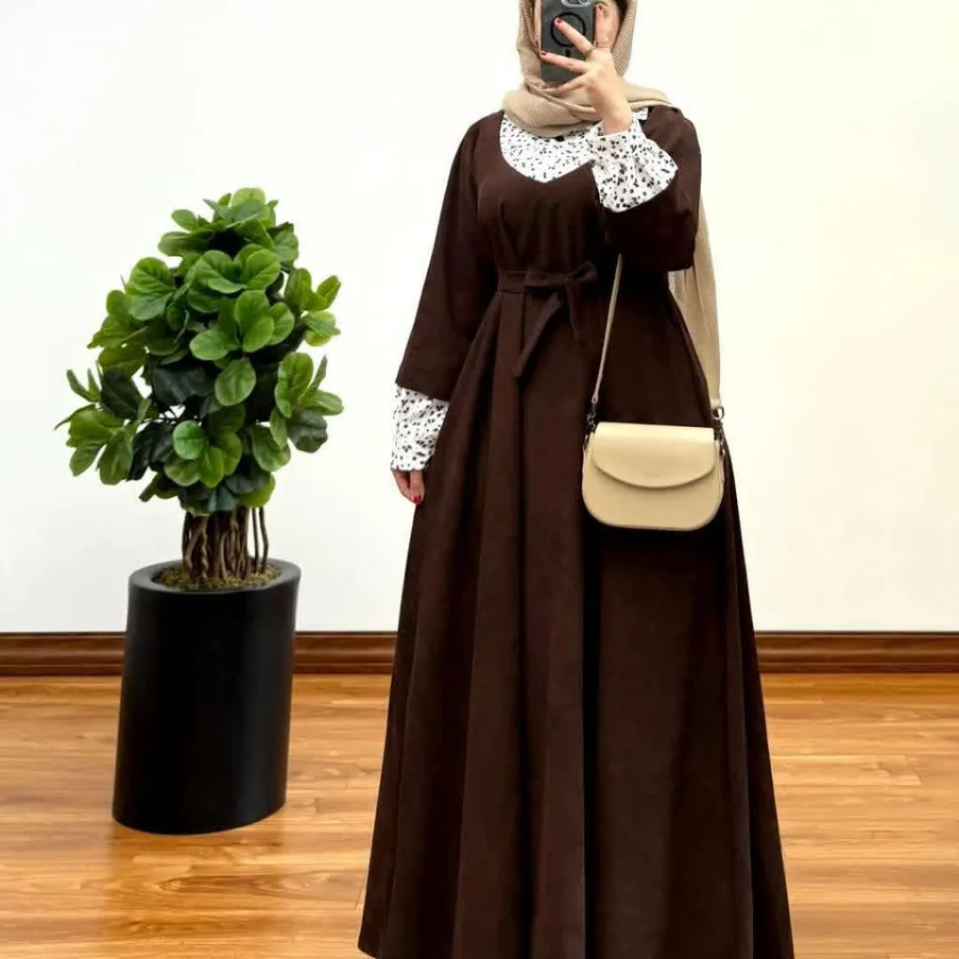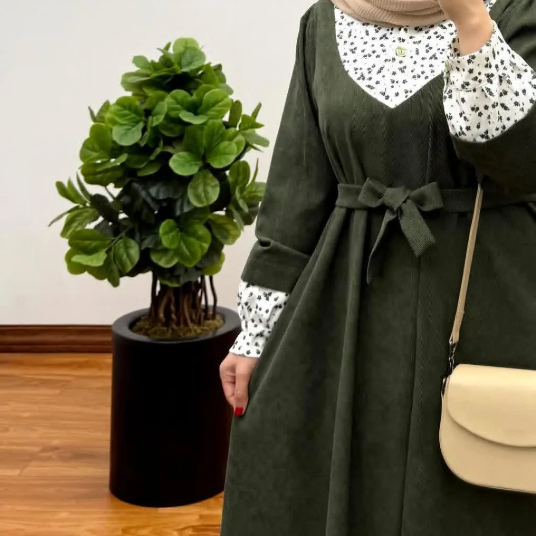 یه پیراهن سوپر کاوش با قد کاملا بلند با کمربند جنسش مخمل کبریتی هستش. سر آستین و یقه مخمل کبریتی طرح اره سر آستین مچی هستش و دکمه خوره کاملا سوپر کلوش. یه کمربند از جنس خودش داره که میتونین ببندین و سایزتوند رو کنید.